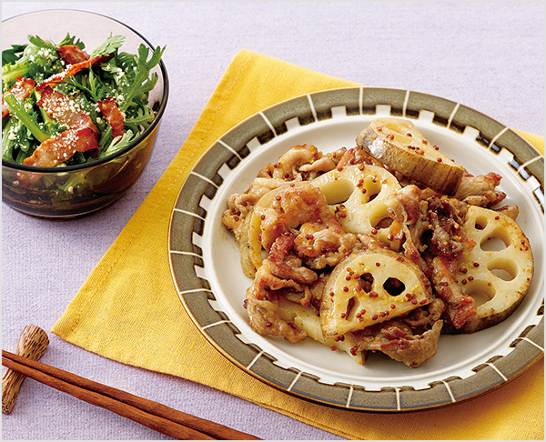 皮ごと調理でシャキシャキ食感 れんこんと豚こま肉のマスタード炒め