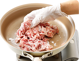 - フライパンに豚肉を入れて下味Ⓑを付ける。片栗粉をまぶして全体になじませる。