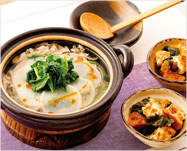 主菜は、豚肉とかぶのたった2つの食材で作る簡単鍋です。かぶは、普段食べている白くて丸い実は淡色野菜に、葉や茎の部分は緑黄色野菜に分けられる、部位によって分類が異なる野菜です。白くて丸い実にも葉や茎の部分にも、多くの栄養素を含んでいます。とくに余りがちな葉の部分は、抗酸化作用を持つβ-カロテン※(ビタミンA)の栄養価が高く、皮膚や粘膜の健康維持に役立ちます。
